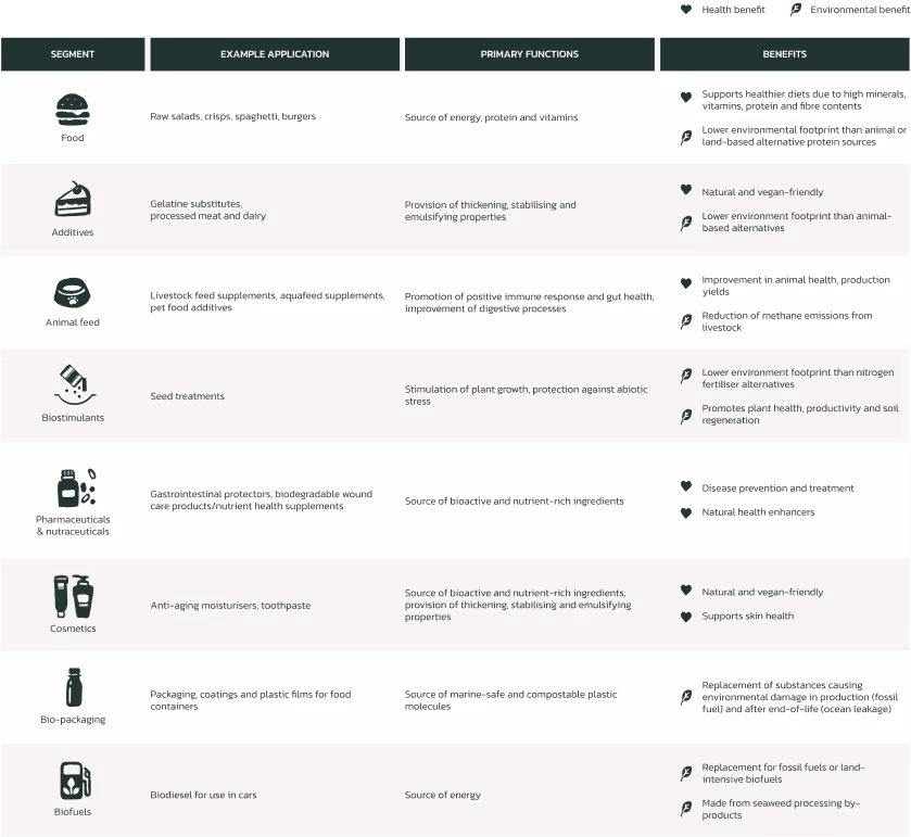 Low Resource Requirements: Seaweed doesn't require freshwater for growth as it thrives in abundant seawater; does not need fertilisers (which are mostly fossil-based); and it does not compete for land-use (e.g. with food crops).