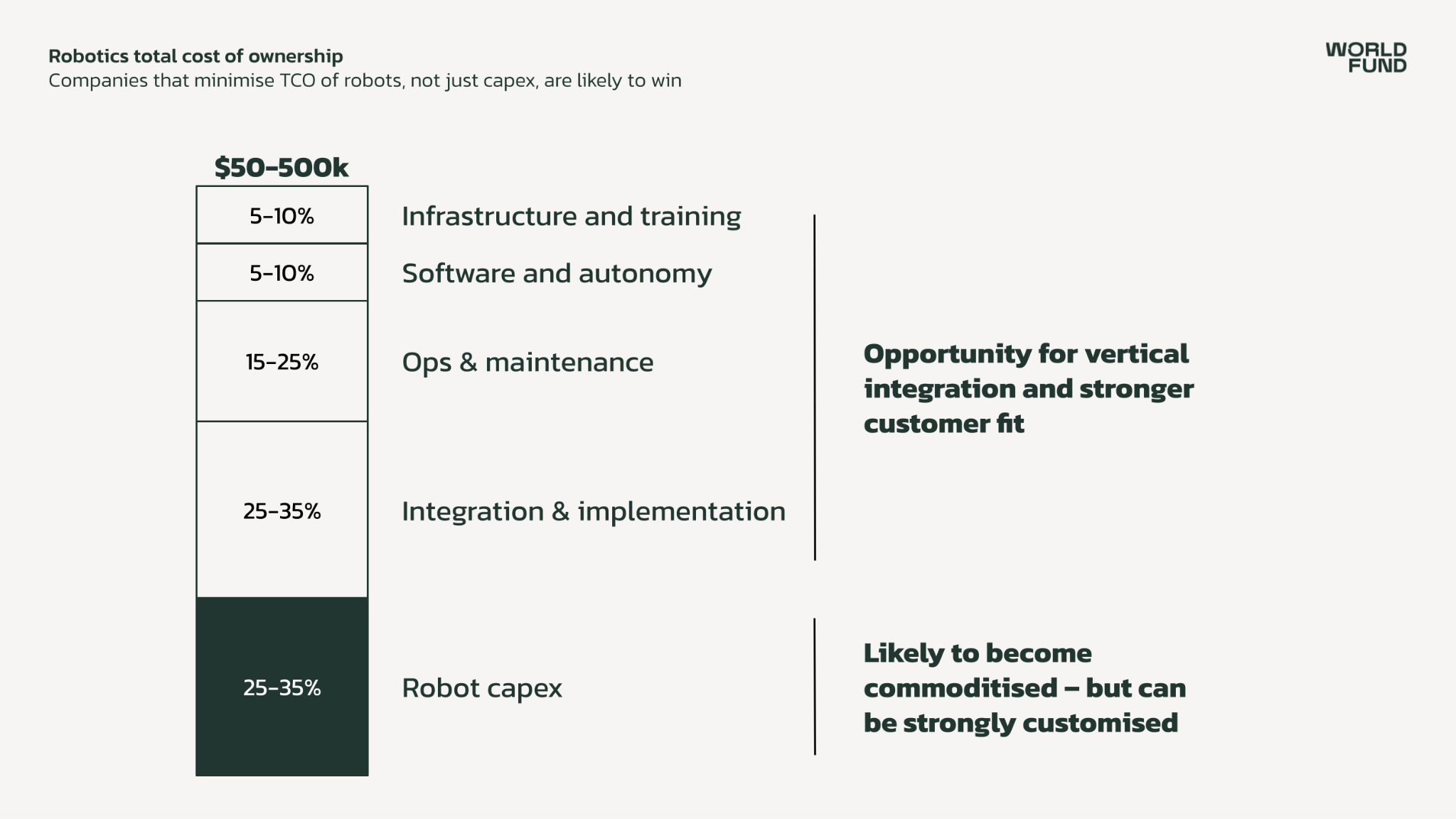 Based on our research and conversations, we estimate that hardware for advanced robots accounts for around 25-35% of the total cost of ownership, though this can vary strongly depending on the end-application.