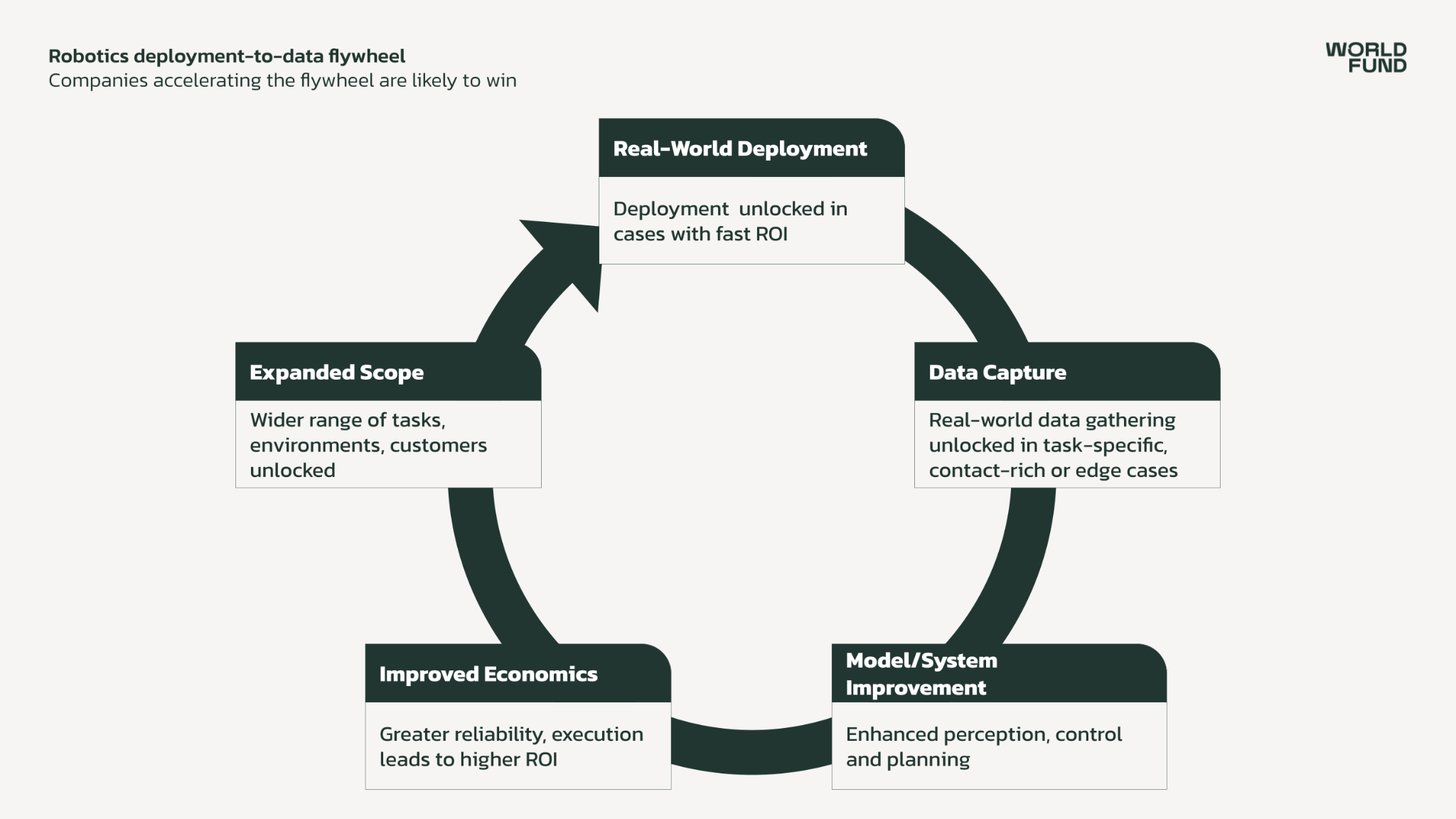Third, they own the data generated during deployment. The robots gathering real-world data belong to the company, not the customer – exemplified by increasing adoption of RaaS models. Customers accept this because they still get a strong solution without worrying about the trickier aspects of deployment. This data ownership enables continuous improvement: the robots in the field effectively become a training fleet. Rivals without deployment at scale simply cannot learn as fast, even if their lab prototypes are technically comparable.
